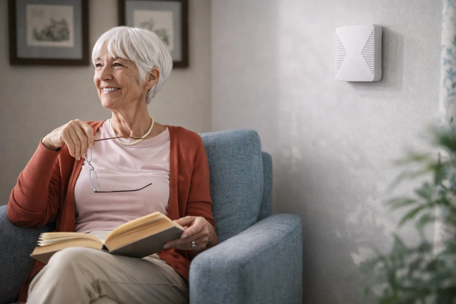 Small wall-mounted sensors help detect falls and safety risks using radar — no cameras, no wearables, nothing for your parent to do.